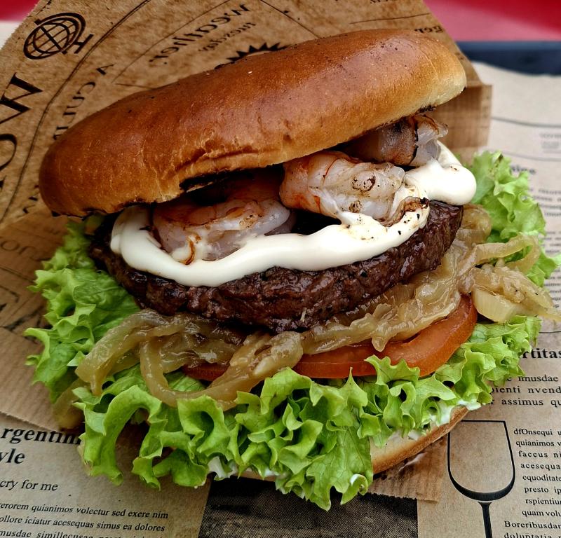 Brioche Bun l Beefpatty l gegrillte Garnelen l white BBQ-Sauce
