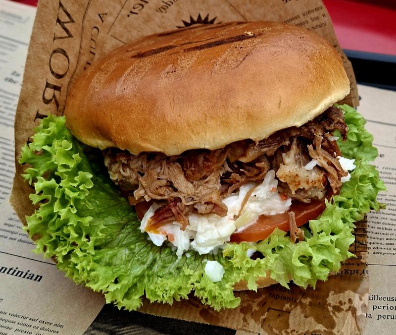 Homemade long Bun / Porkpatty / Zwiebel / Gurke / Special-BBQ-Sauce